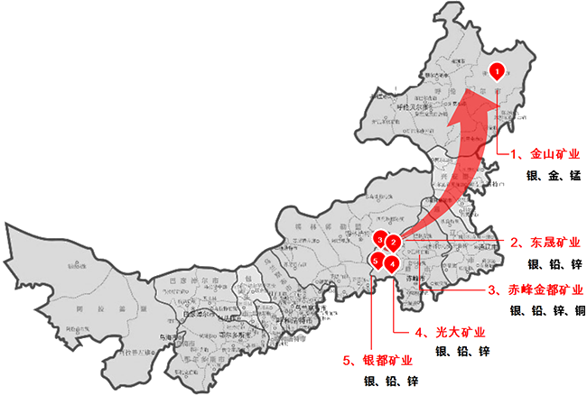 原生矿产金属资源结构横纵南北。。。。。。北以内蒙古自治区中东部为中心,,,,,围绕海内主要白银、铜、铅锌多金属成矿区结构,,,,,旗下银都矿业、光大矿业、金都矿业、东晟矿业、德运矿业均属于“大兴安岭西坡银、铅、锌成矿带”,,,,,是海内外瞩目的寻找大型、特大型以致天下级有色金属矿床重点地区。。。。。。位于内蒙古金山矿业所属的额仁陶勒盖矿区是海内单体银矿储量最大、生产规模最大的自力大型银矿山之一。。。。。。南以我国主要的黄金等贵金属成矿带、位于四川甘孜-理塘结构带南段为焦点,,,,,结构黄金金属资源,,,,,四川鸿林矿业的焦点资产菜园子铜金矿就位于自古有着“黄金王国”美誉的四川凉山州木里县境内,,,,,该区域矿区金属品位高,,,,,未来深耕挖掘,,,,,增储潜力重大。。。。。。
